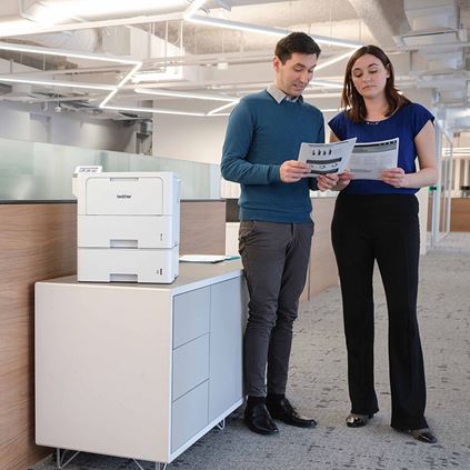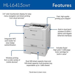 The Brother Workhorse HL-L6415DWT enterprise monochrome laser printer offers enterprise-level performance, dual paper trays, advanced security features, and reliable, high-quality output for mid to large-sized workgroups. This high-performance printer helps to increase productivity with a fast print speed of up to 52ppm. Reduce paper refills with dual 520-sheet capacity paper trays. Add an additional tray for extra capacity as your business needs grow. Delivers built-in value with an included super high-yield toner cartridge and a low total cost of ownership by using the TN925 Brother Genuine max yield replacement toner cartridge. Triple Layer Security features help to limit document and device access and protect against network intrusions. The HL-L6415DWT also provides flexible connectivity with built-in Gigabit Ethernet and dual band wireless networking, plus convenient mobile device printing to meet mobile workforce demands.